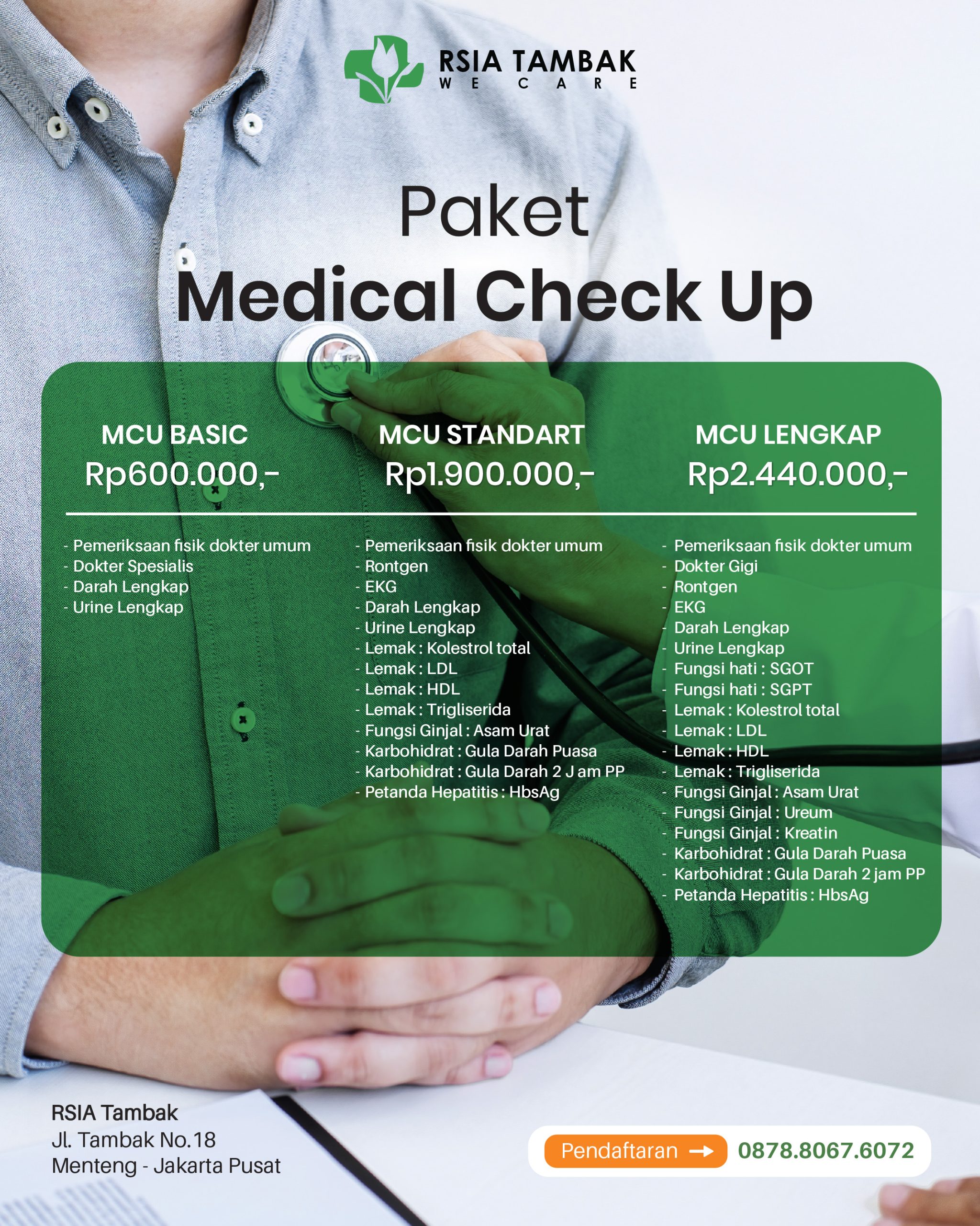 RSIA Tambak menghadirkan Paket Medical Check Up lengkap untuk wanita, pria, hingga lansia, dengan pemeriksaan menyeluruh yang dilakukan oleh tenaga medis profesional. Setiap layanan dirancang untuk memberikan hasil yang akurat dan sesuai kebutuhan kesehatan Anda.