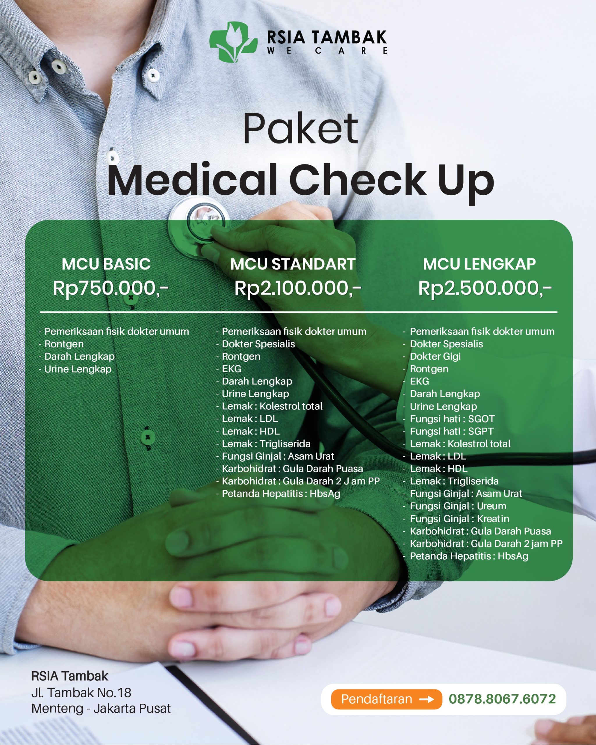 RSIA Tambak menghadirkan Paket Medical Check Up lengkap untuk wanita, pria, hingga lansia, dengan pemeriksaan menyeluruh yang dilakukan oleh tenaga medis profesional. Setiap layanan dirancang untuk memberikan hasil yang akurat dan sesuai kebutuhan kesehatan Anda.