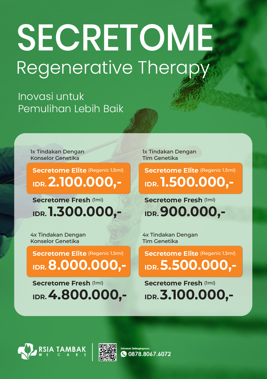 Secretome merupakan terapi berbasis growth factors dan molekul bioaktif yang bekerja untuk mendukung proses regenerasi sel tubuh. Di RSIA Tambak, kami menghadirkan Paket Secretome dengan prosedur yang aman, diawasi oleh dokter berpengalaman, serta dilakukan dengan standar medis yang ketat.