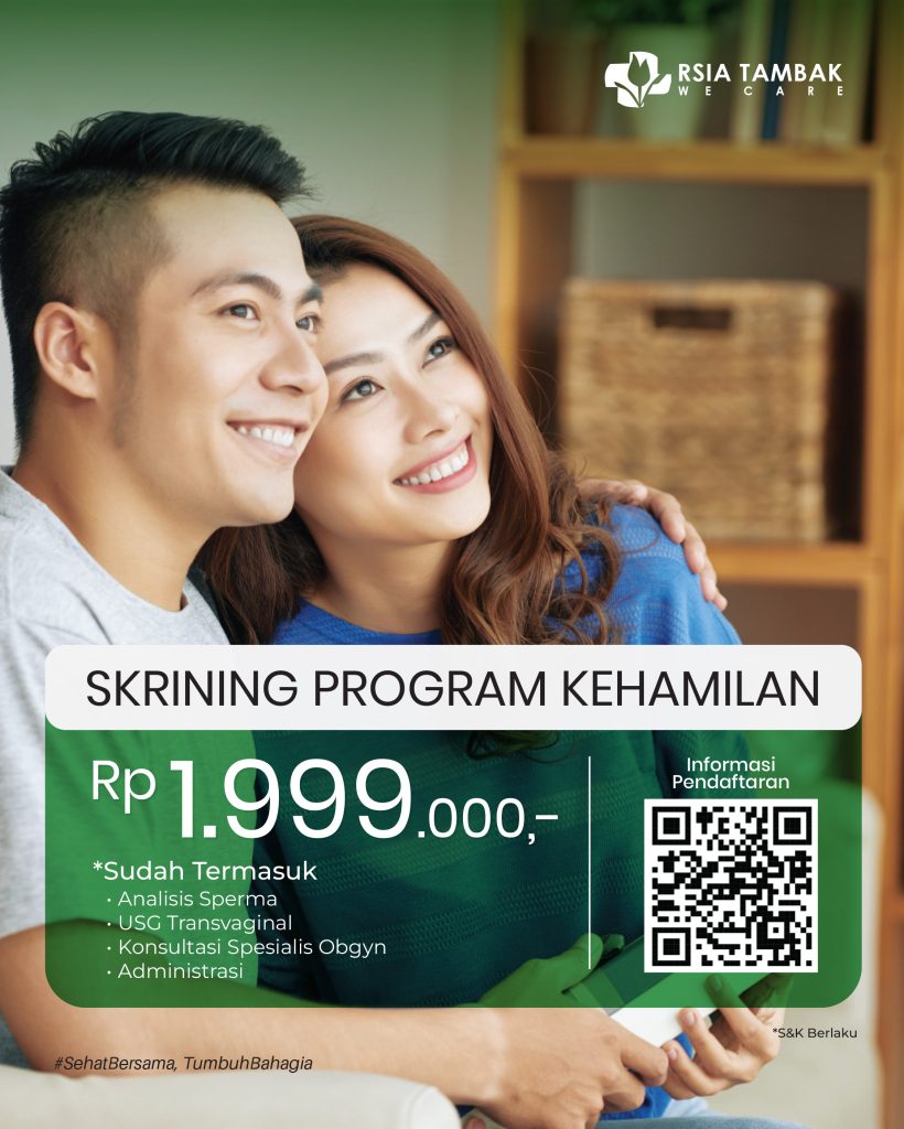 Rencanakan kehamilan yang sehat dan aman bersama RSIA Tambak. Melalui Paket Skrining Program Kehamilan, kami membantu pasangan untuk mengetahui kondisi kesehatan sejak awal, mempersiapkan tubuh dengan optimal, serta meminimalkan risiko selama proses kehamilan.
