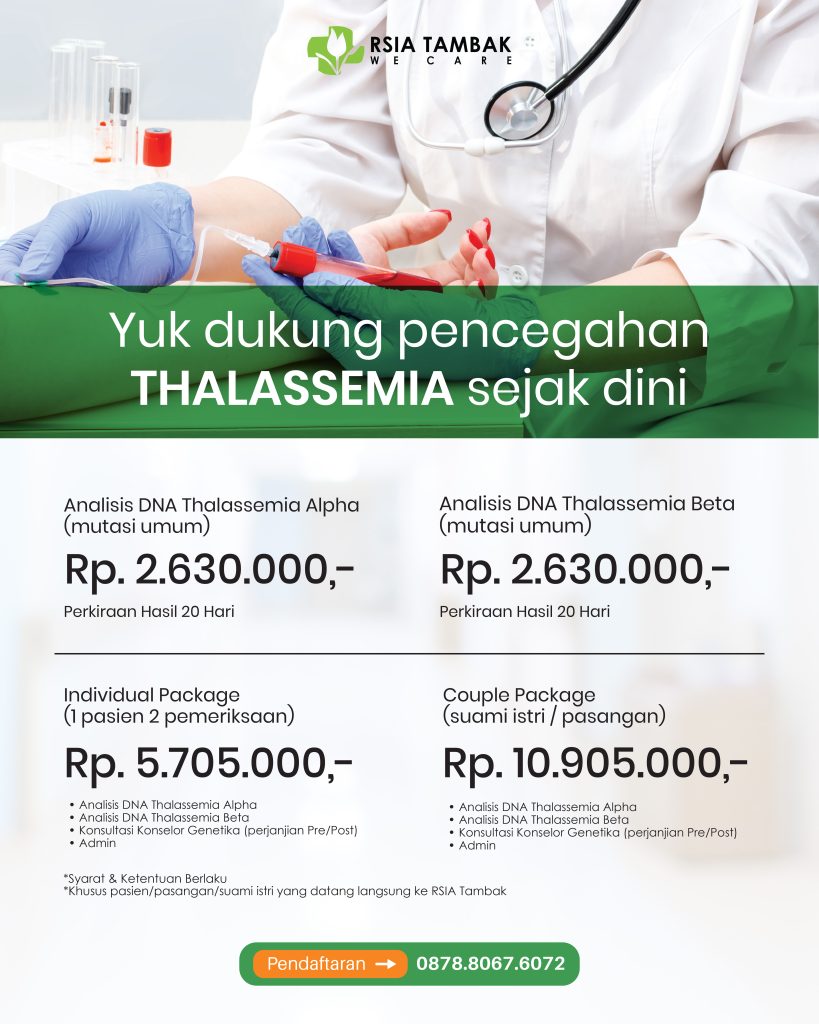 Thalassemia adalah kelainan darah yang dapat diturunkan dari orang tua kepada anak. Melalui Paket Skrining Thalassemia, RSIA Tambak membantu calon pasangan dan keluarga untuk mengetahui kondisi pembawa sifat (carrier) sejak dini, sehingga dapat mencegah risiko menurunkan thalassemia mayor pada anak.